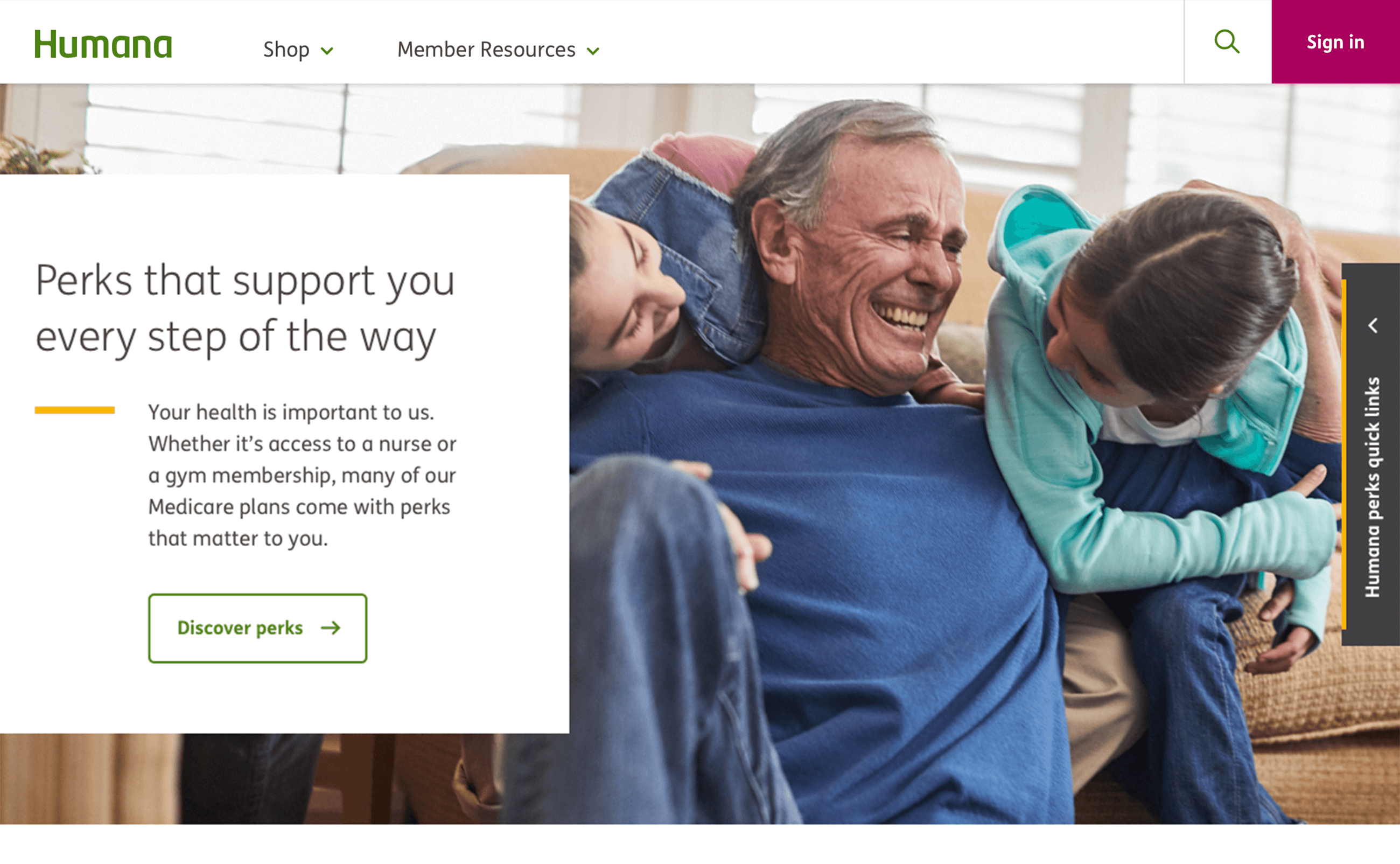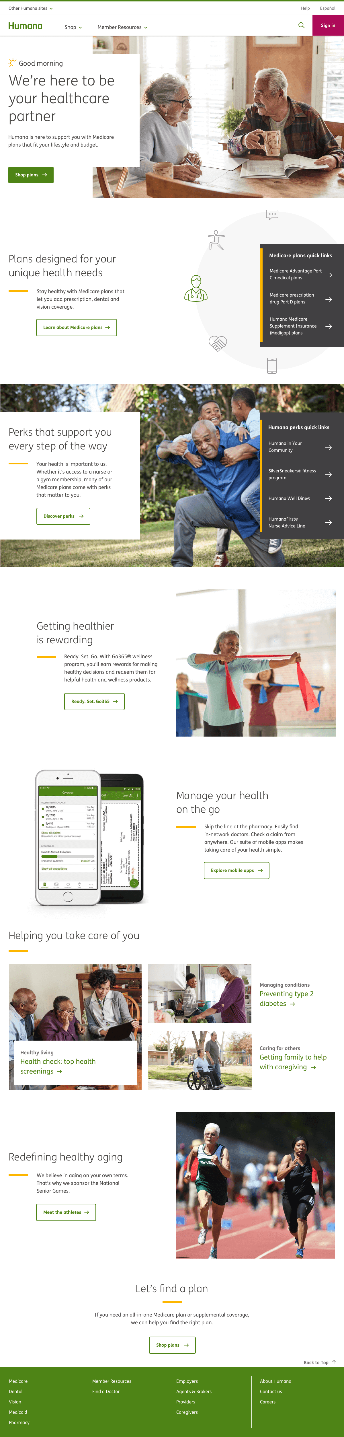 Solution: We created an approachable, empowering, and intuitive website that demonstrates Humana is the right partner in health—powered by people who care. This clean, modernized and fully compliant experience guides boomers and seniors towards good health through education, exploration, and engagement while providing access to all of Humana's benefits, services, and plans.